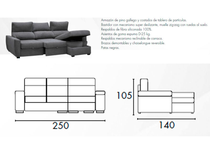 Armazón de pino gallego y costados de tablero de partículas.Bastidor con mecanismo super deslizante, muelle zig-zag con ruedas al suelo.Respaldos de fibra siliconada 100%.Asientos de goma espuma D-25 kg.Respaldos mecanismo reclinable de carraca.Brazos demontables y chaiselongue reversible.Patas negras.Medidas: 250cm ancho x 140cm fondo x 105cm alto.