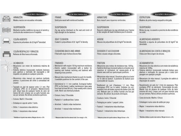 Mecanismo con motor de resistencia máximna de 120kg.Sistema eléctrico incorporado mediante botonera para apertura y reclinado del reposapiés y del respaldo con parada encualquier posición.Mecanismo relax manual con apertura mediante palanca. 3 posiciones del sillón a comodidad del usuario.Tapizado en piel de espero entre 1,1mm. Piel ecológica. (PCV en el armazón).